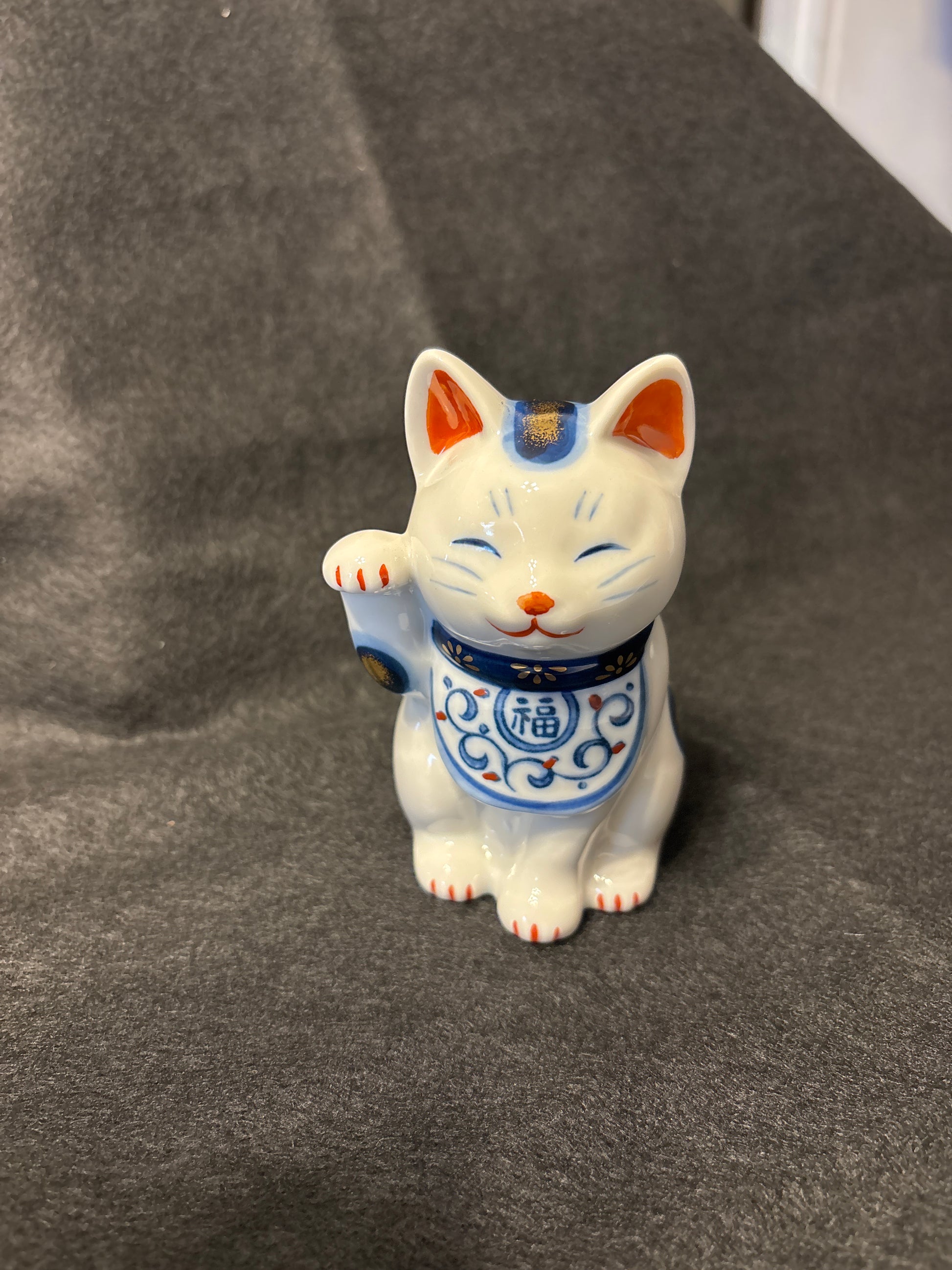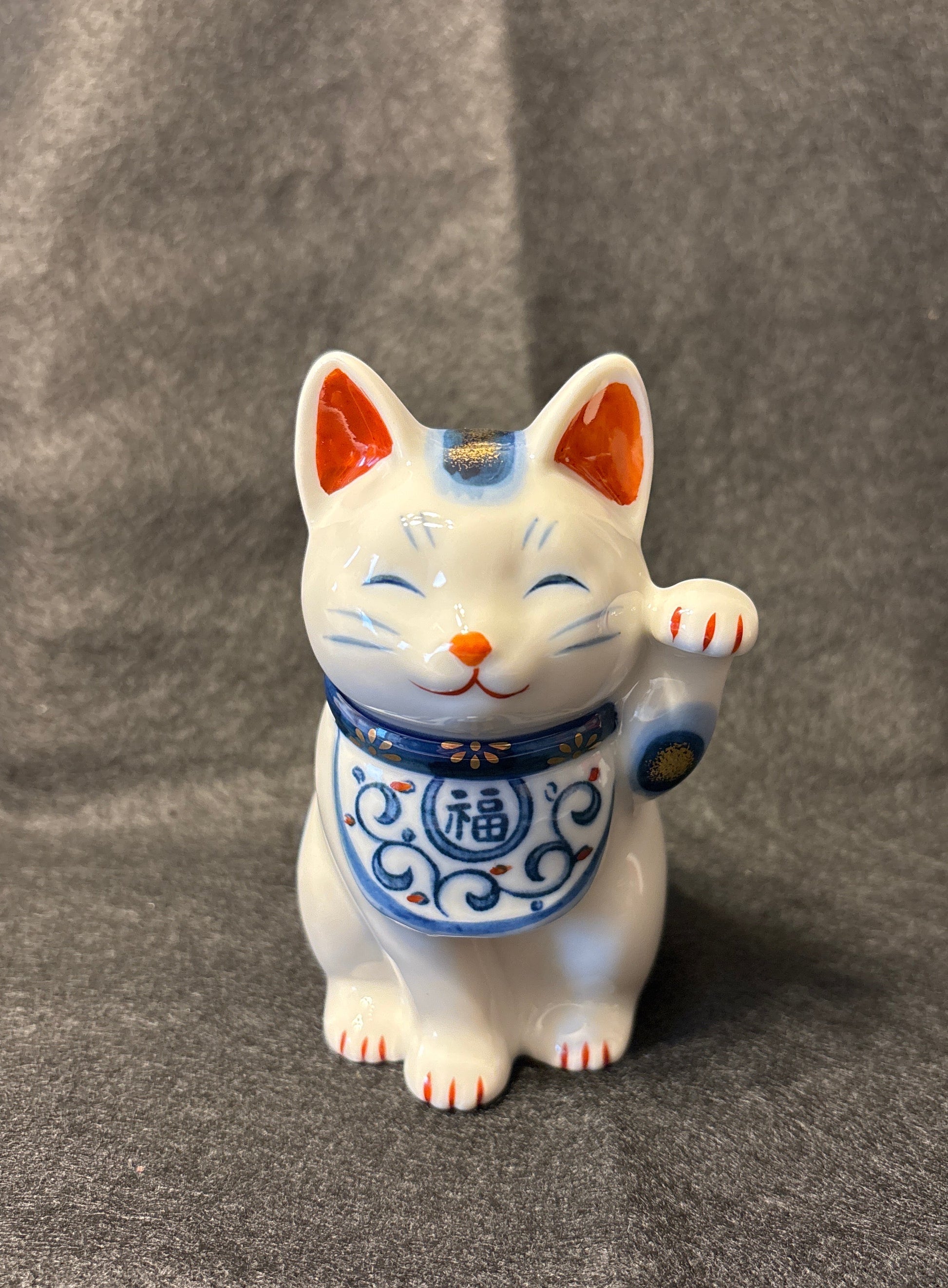 Manekineko, porte-bonheur japonais. Porcelaine de Seto, décor bleu et blanc.